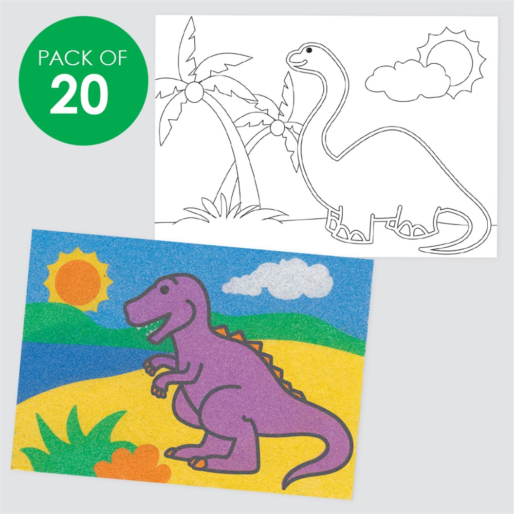 Create beautiful sand art masterpieces with these dinosaur sheets! 4 assorted pre-printed designs on 250gsm adhesive board. A5 size. Sand and Foil Art Sheets sold separately. Designs may vary.