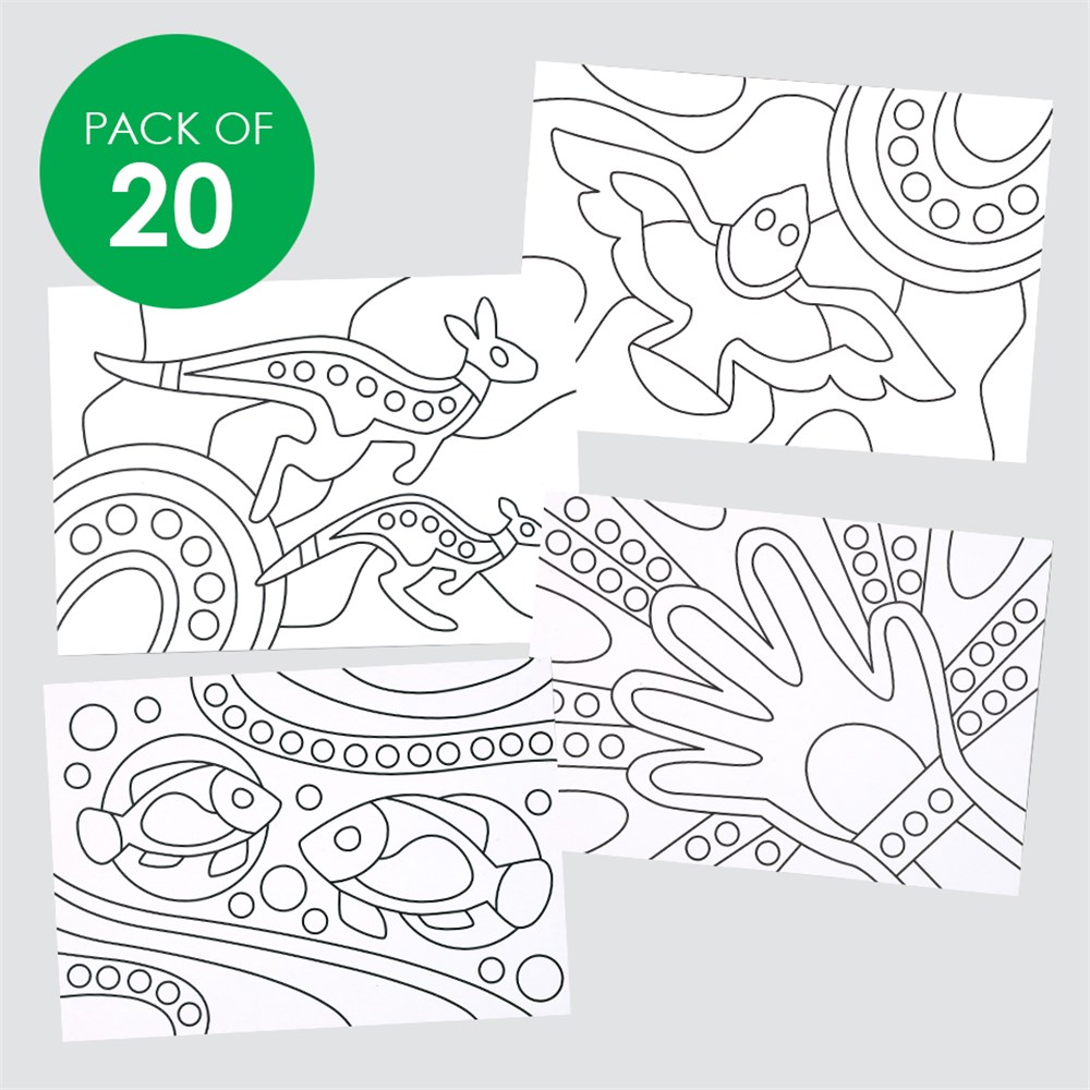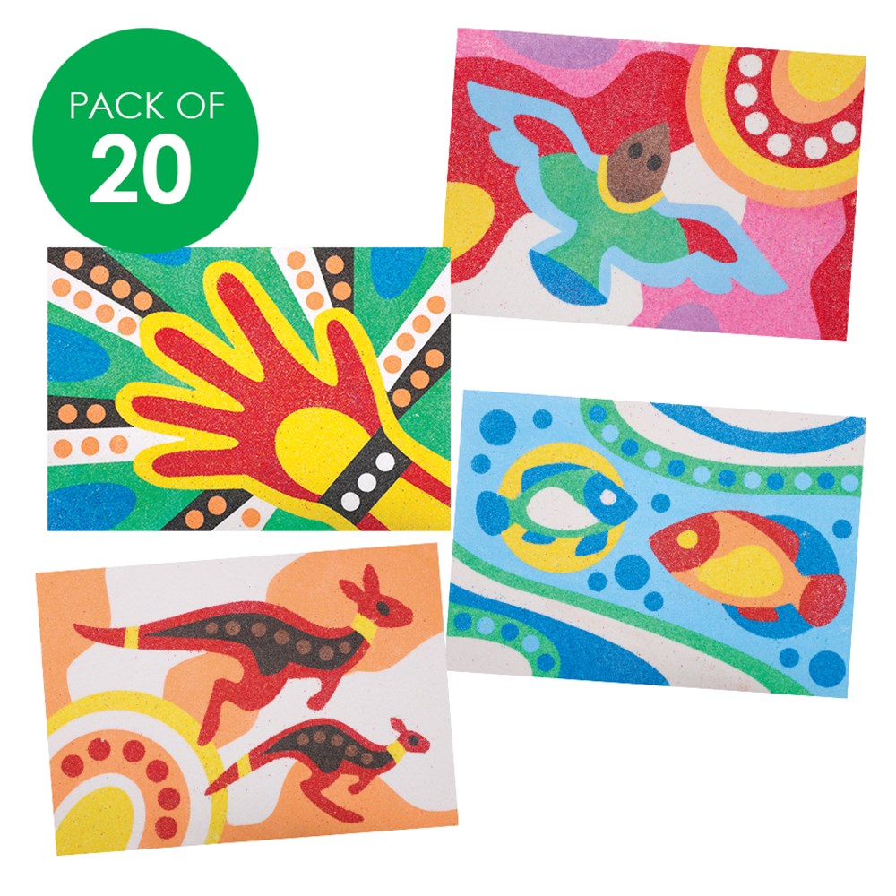 20 sheets (4 assorted designs per pack) of stunning Australia-themed, Indigenous designed sand art sheets!