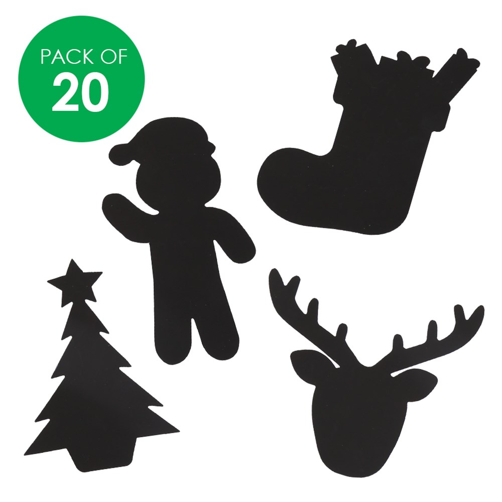 4 assorted designs. Supplied in sheet form with 1 of each design per sheet. Plain for you to create. Scratch paper with self-adhesive backing. Reindeer measures 10 x 9cm. Scratch Board Tools sold separately.