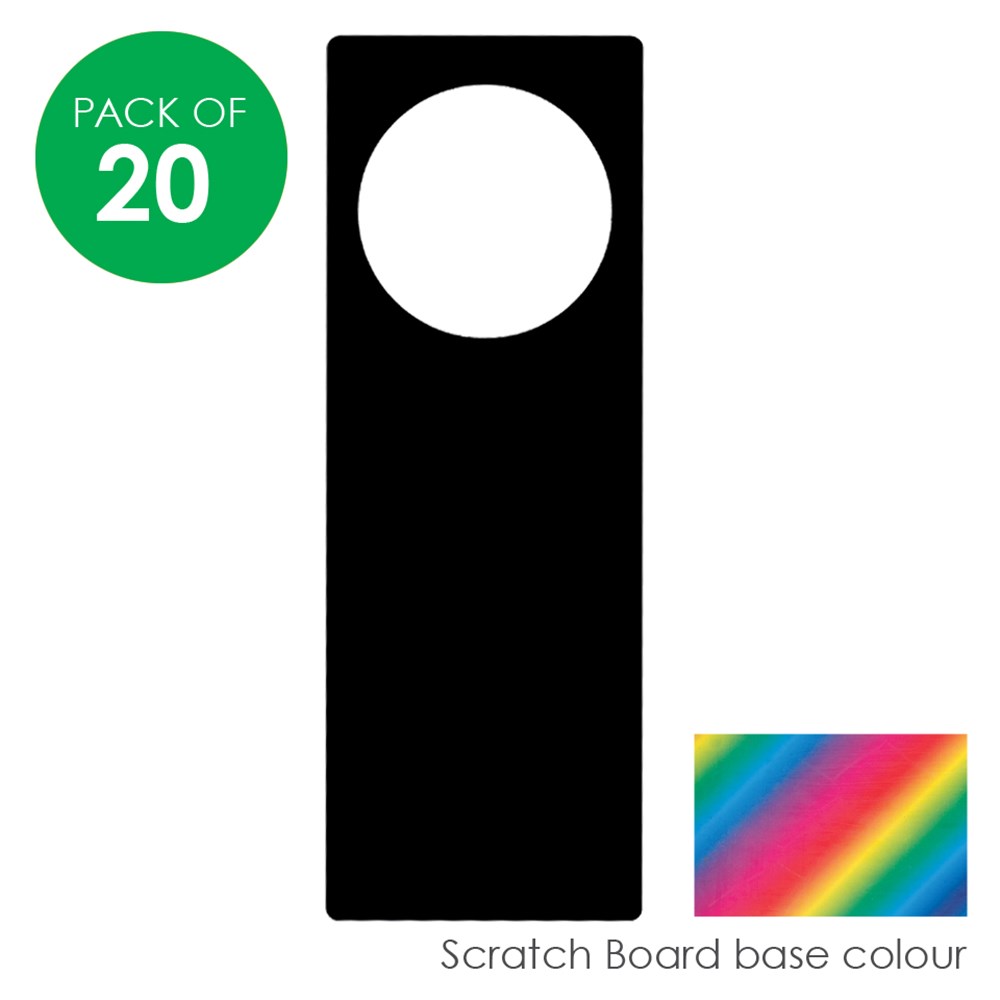 Scratch directly onto the board surface and your drawings will appear in multicolour! So easy and lots of fun. Experiment with different designs and patterns. Plain for you to create. Each scratch board door hanger measures 10 x 28cm. 250gsm board. Scratch Board Tools sold separately.