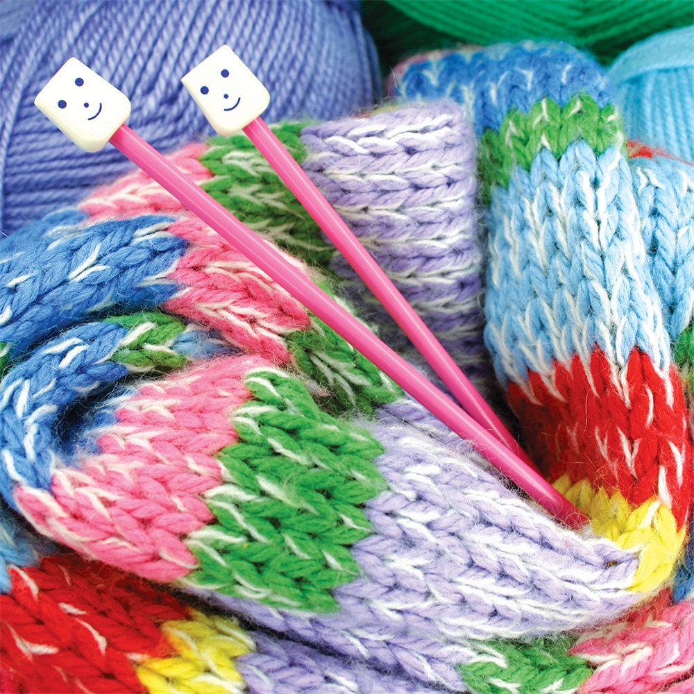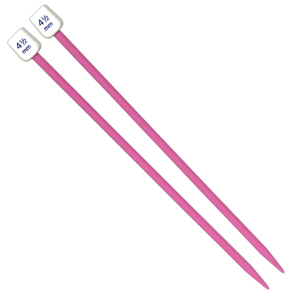 Plastic knitting needles ideal for little hands. Colours and size may vary. Measures 4.5mm x 18cm.