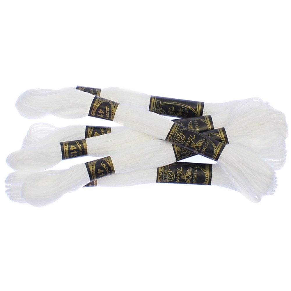 White embroidery thread measuring 48m long. 6 bundles of 8m lengths. Colour may vary.