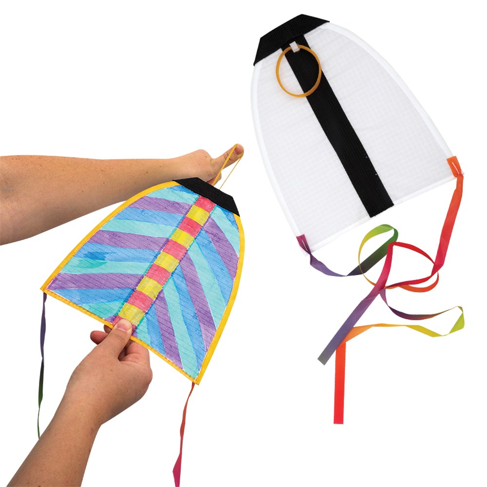 Each kite has an attached rubber band to make your kite launch through the air! Simply stretch the rubber band out in front then release. Kites are provided plain for you to decorate and have a sewn in wire frame for dynamic flying effects.