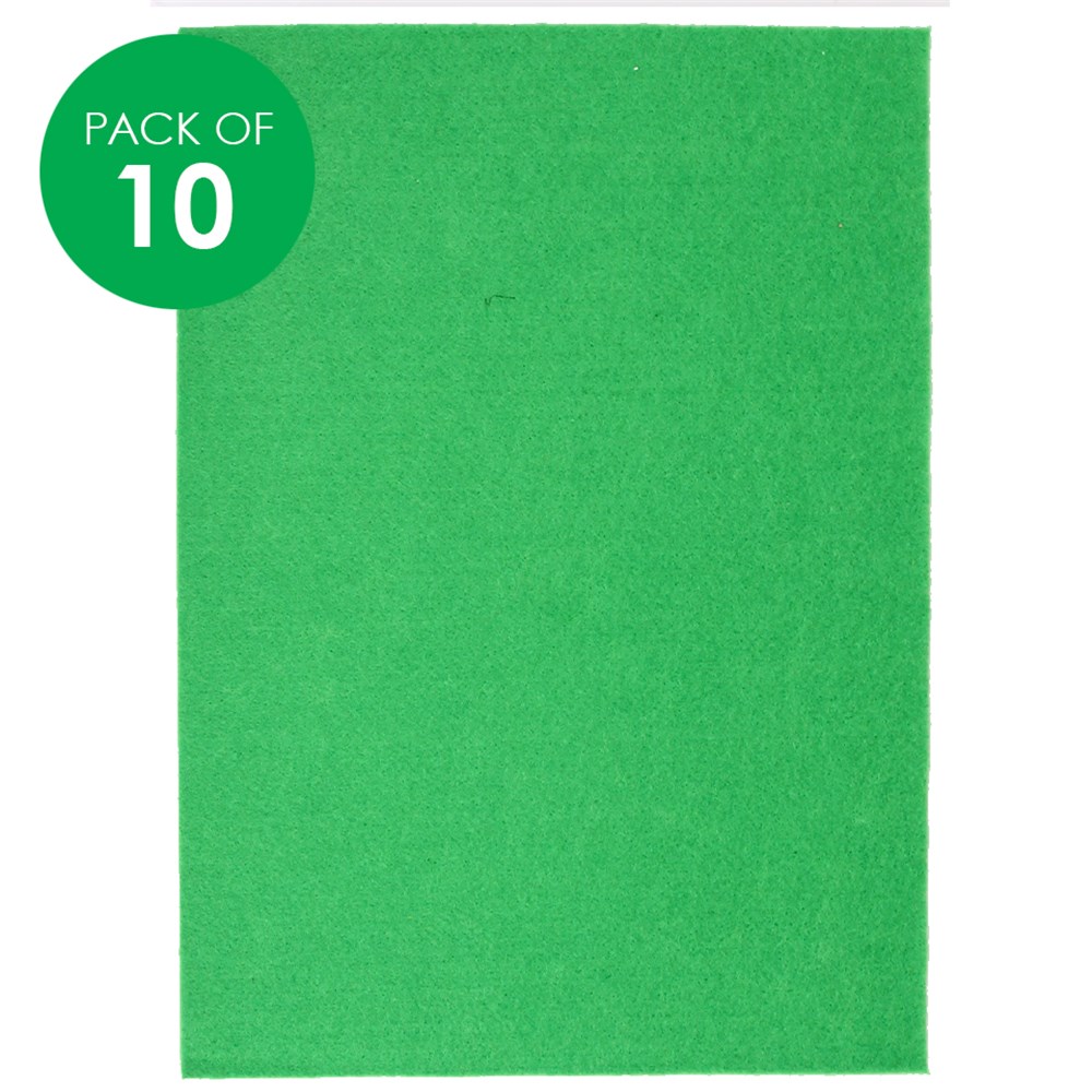 Green acrylic felt. Pack includes 10 sheets. Each sheet measures 31 x 23cm.