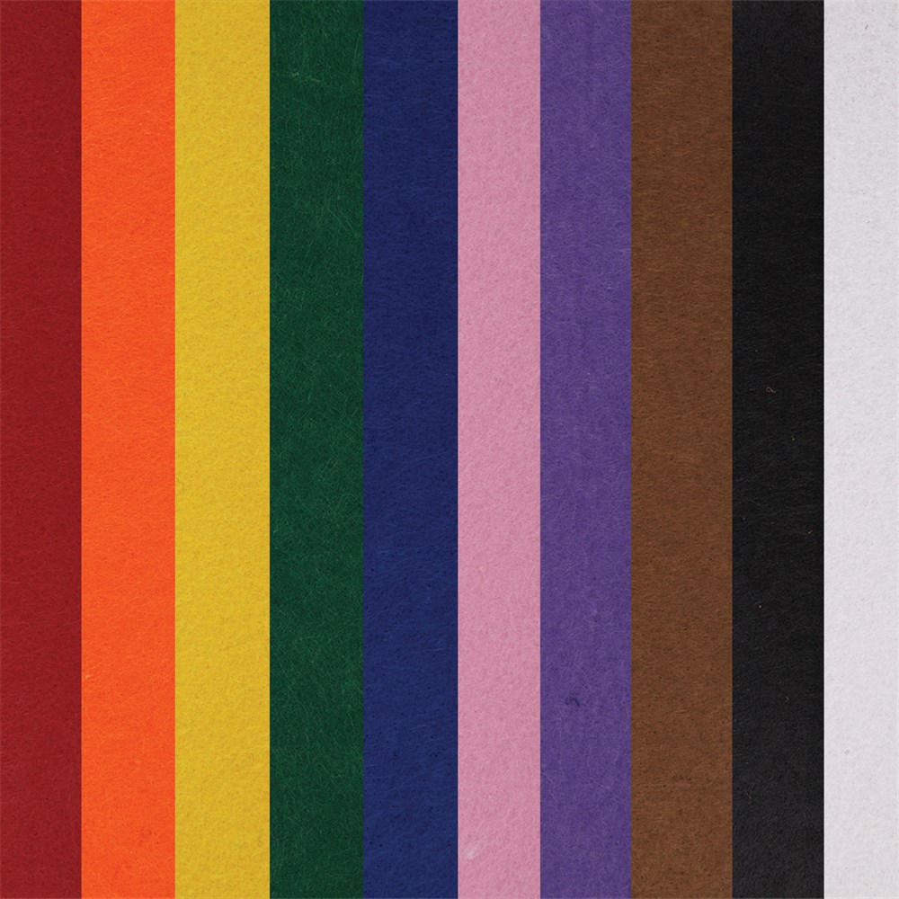 100 acrylic Felt Squares in 10 assorted colours (10 of each colour). Each square measures approximately 23 x 23cm. Colours may vary.
