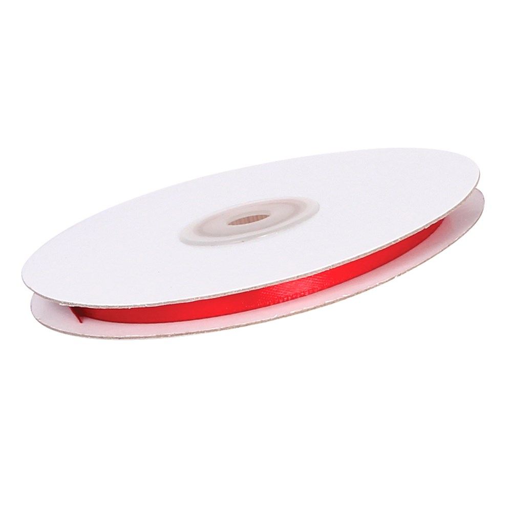 Red satin ribbon measuring 6mm x 25m long.