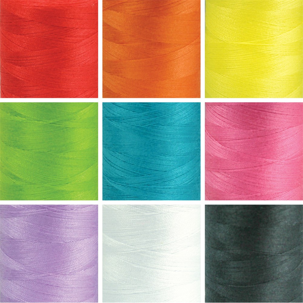 100% spun polyester sewing thread. 1,000m per roll. Set of 9 includes 1 roll of each colour (red, orange, lemon, green, turquoise, pink, purple, white, black).