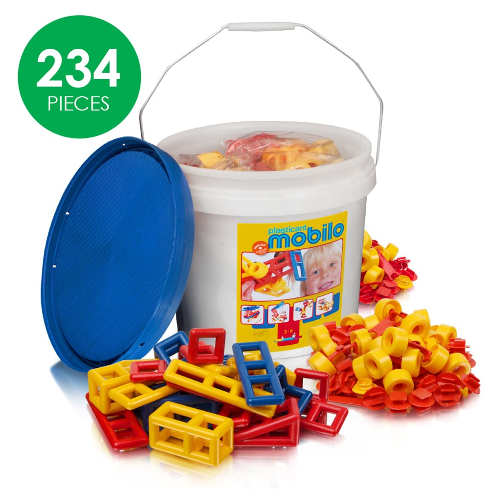 Encourage creative thinking and improve construction skills with this large bucket of Mobilo. This set has endless possibilities! Includes 234 pieces of Mobilo in a handy storage bucket. For 3-8 years.