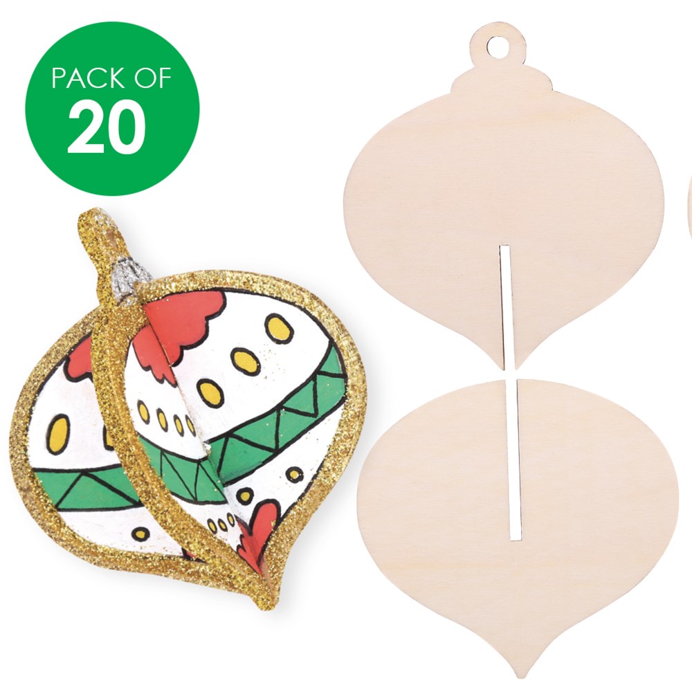 3D wooden baubles supplied flat-packed for easy self-assembly and plain for you to create. Pieces slot together and include a hole for hanging.