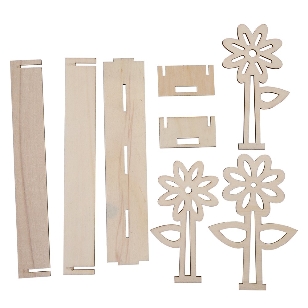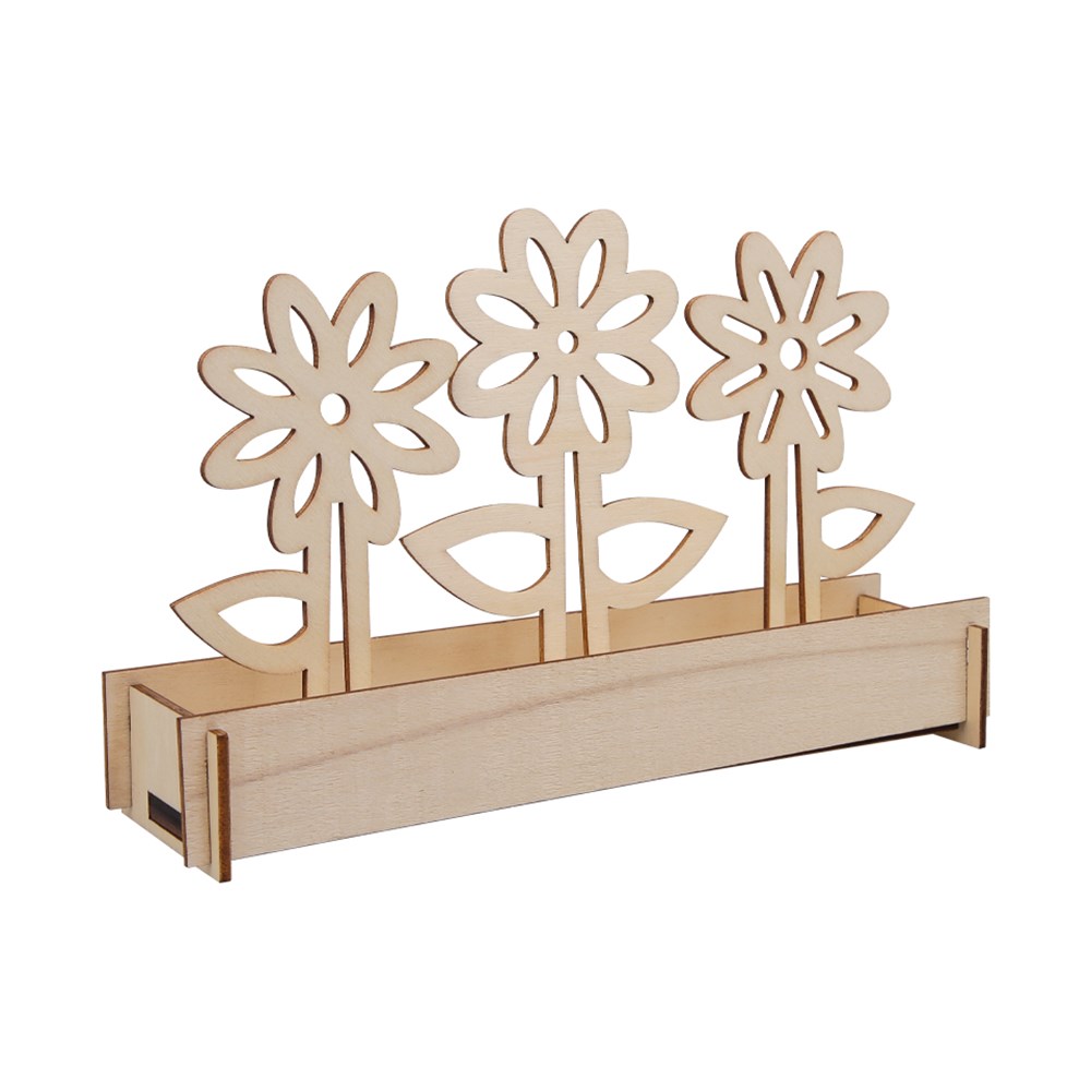 Each flowerbed comes with pieces to make a flowerbed and three flowers. Plain for you to create. Once assembled, the flowerbed measures 19.5 x 4 x 13cm. Made from 2mm plywood pieces with a 5mm thick plywood base. Supplied flat-packed for easy self-assembly.