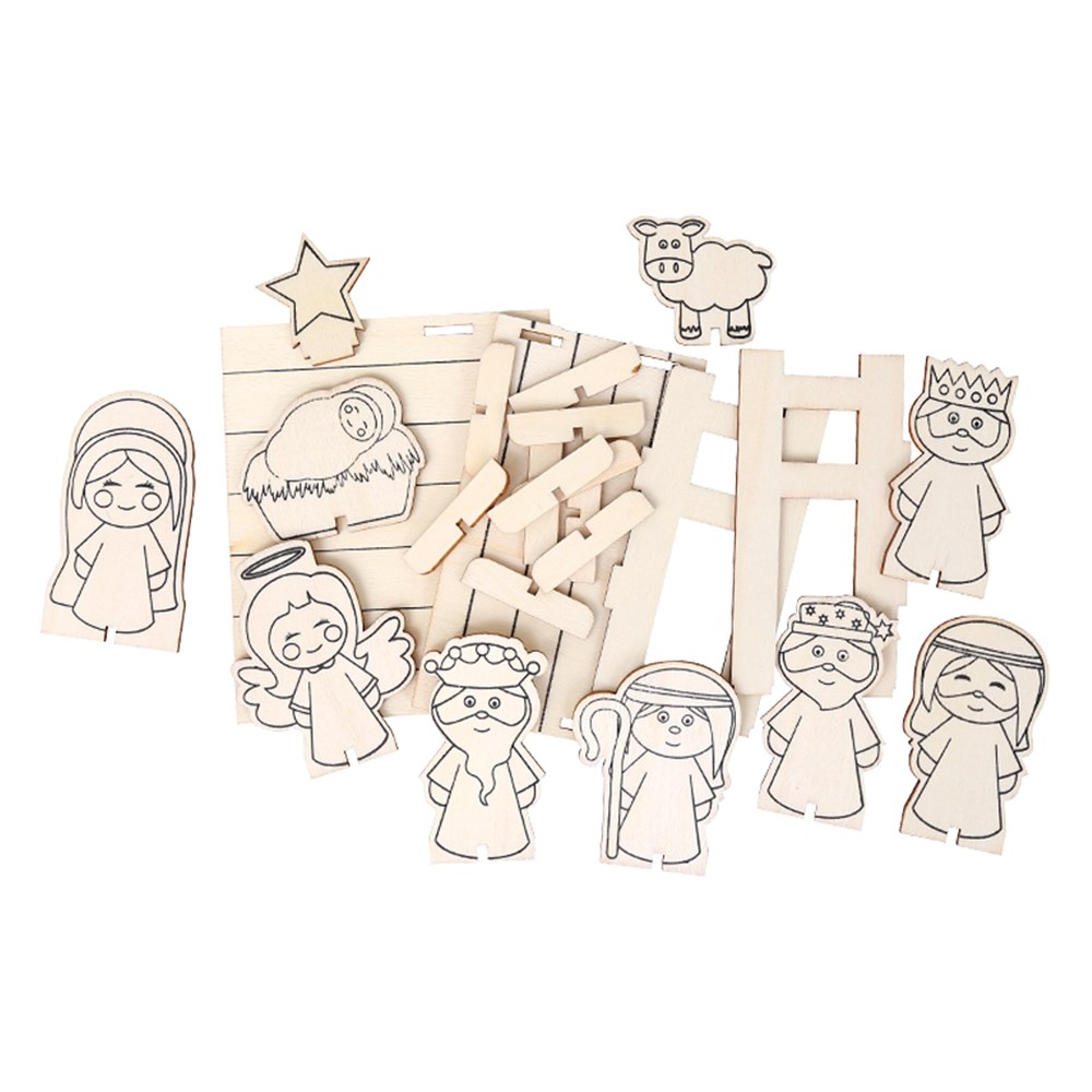 Simply use pencils, markers or paint to colour the pre-printed plywood. Supplied flat-packed for easy self-assembly. Plain for you to create. Stable measures 12 x 6.5 x 10cm when constructed. Shepherd measures 5 x 6.5cm. 2mm plywood.