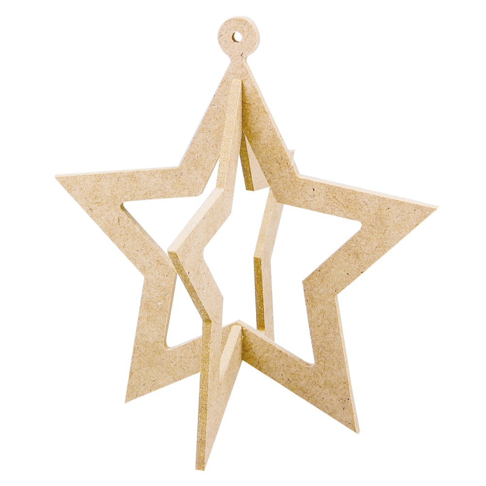 Australian made 3D wooden cutout stars. Supplied flat-packed for easy self-assembly and plain for you to create. Includes a hole for hanging. Star measures 13 x 13 x 14cm. 3mm wood.
