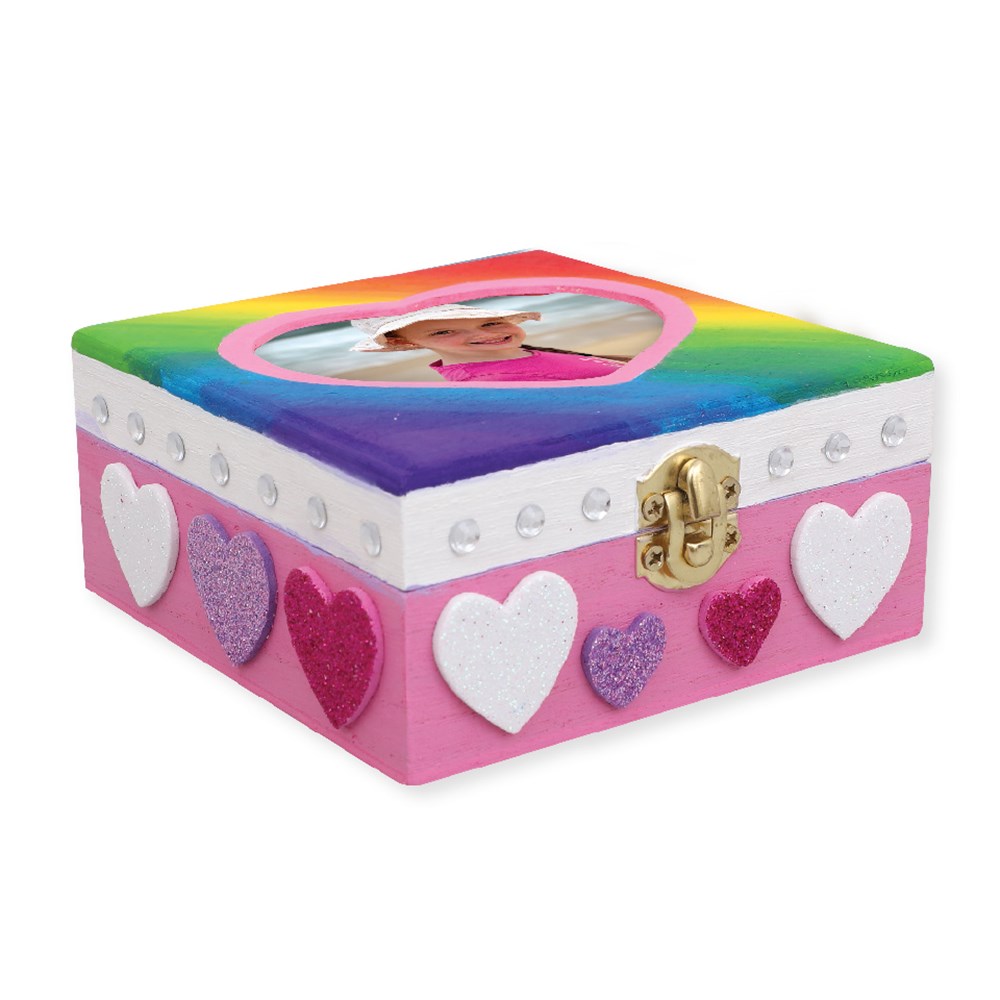 Wooden box with a heart shaped photo frame in the lid.