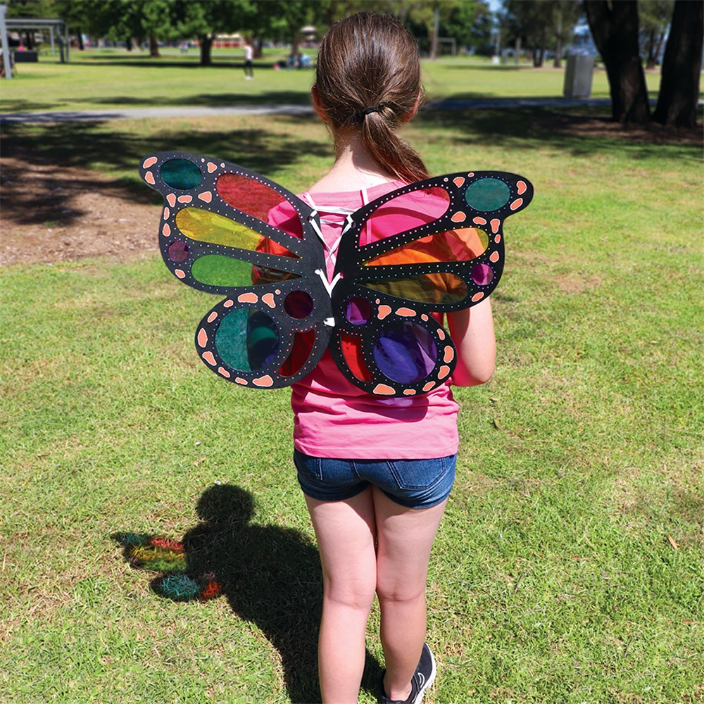 Wings created using plain 3mm plywood so you can create your own magical design! Includes 2 wooden wing shapes. Elastic (20583 - sold separately) is required for assembly. Decorate with cellophane then wear outside on a sunny day to cast a rainbow shadow!
