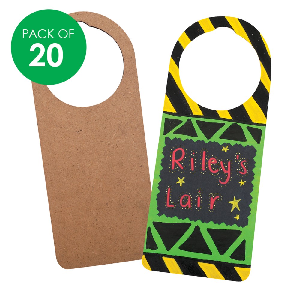 Each pack of Wooden Door Hangers includes 20 plain hangers for you to decorate as well as 20 bonus baubles. Each door hanger measures 10 x 24.5cm. Baubles measure 7.5 x 8cm. 3mm wood.
