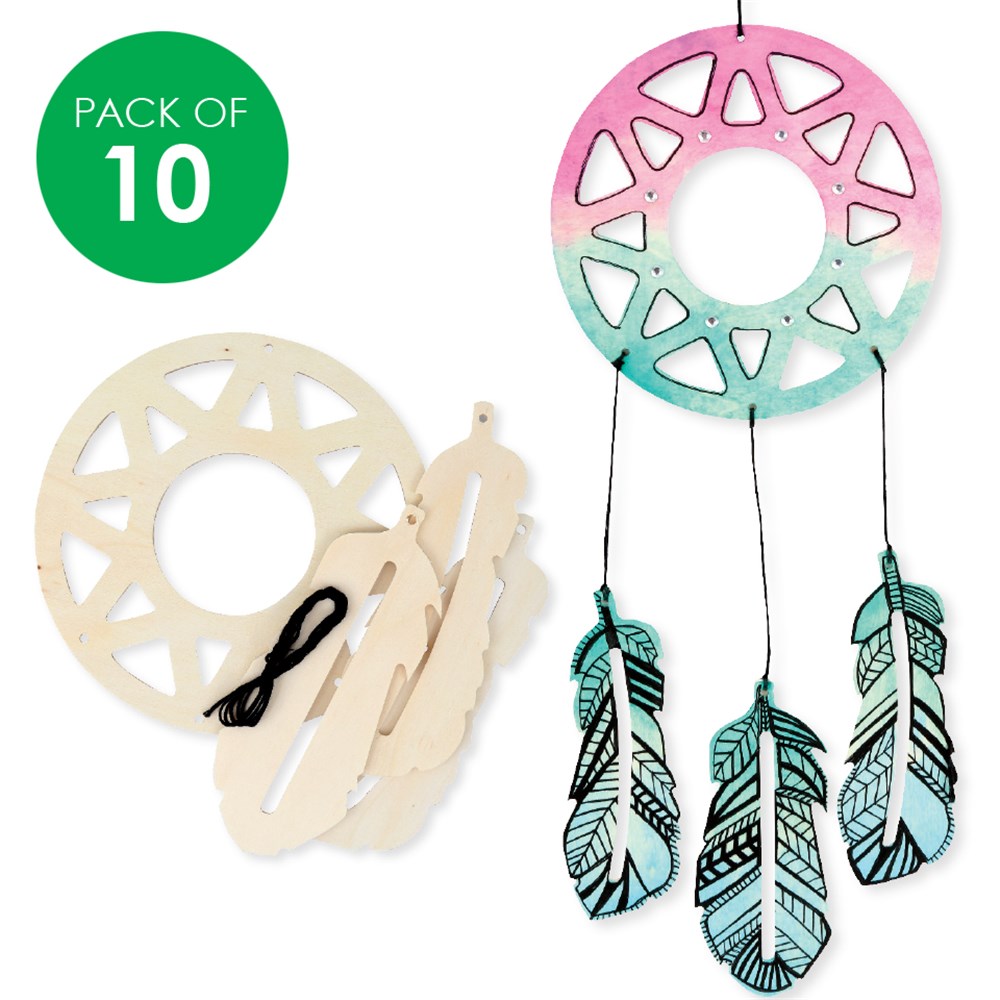 Pack includes wooden pieces and black embroidery thread to create 10 Dream Catchers.
