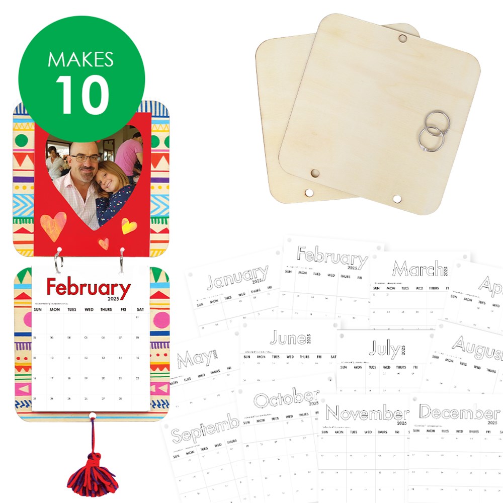 Pack includes all components required to create 10 Wooden Hanging Calendars. Each calendar includes pre-printed and pre-cut 2025 calendar inserts, 2 wooden pieces, 2 silver book rings and holes for hanging. Plain for you to create. Measures 20 x 40.5cm when assembled (excluding hanger). 3mm plywood.