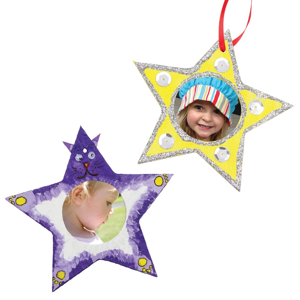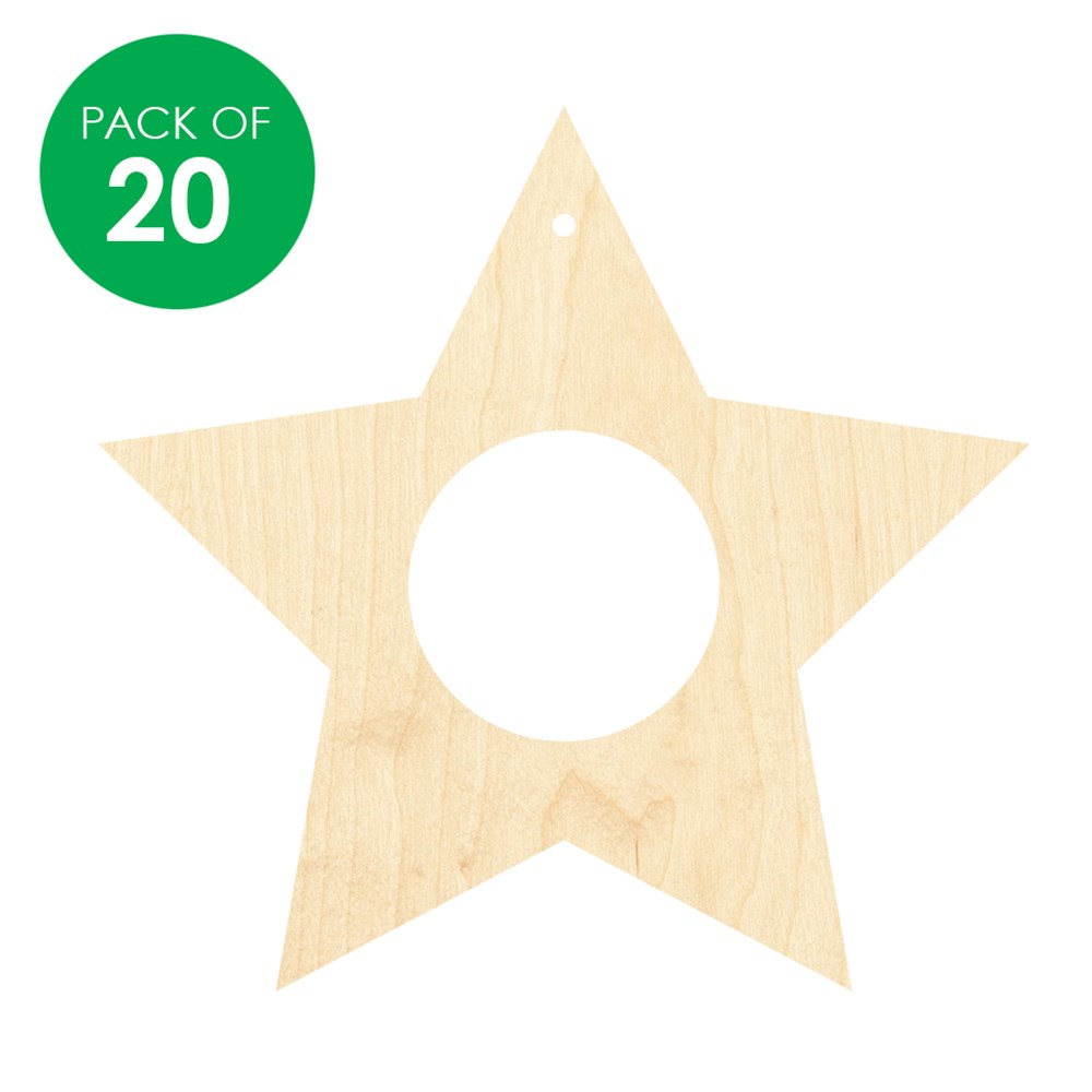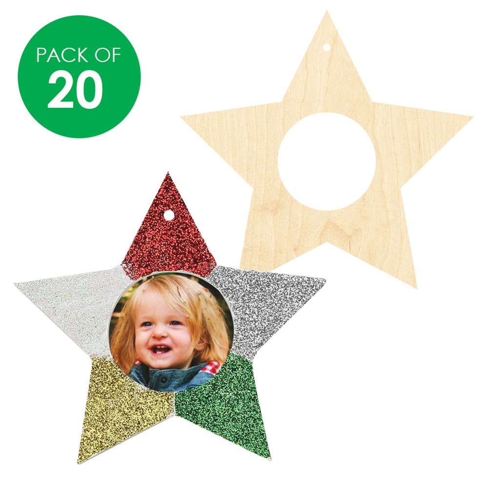 Wooden star frames that come plain for you to create. Each frame measures 12 x 12cm. Space for photo measures 4cm in diameter. 3mm plywood. Includes a hole for hanging.